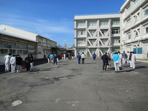 中庭で体験的な実習を行い、逆打ちで校章を描きました。